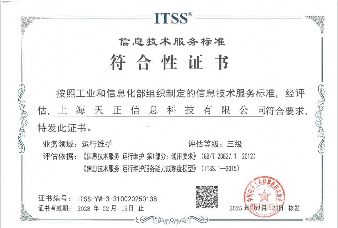 喜報!熱烈慶祝天正信息成功通過ITSS三級認(rèn)證,邁向服務(wù)新高度!